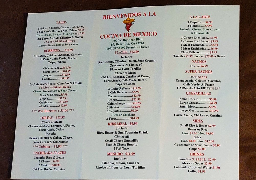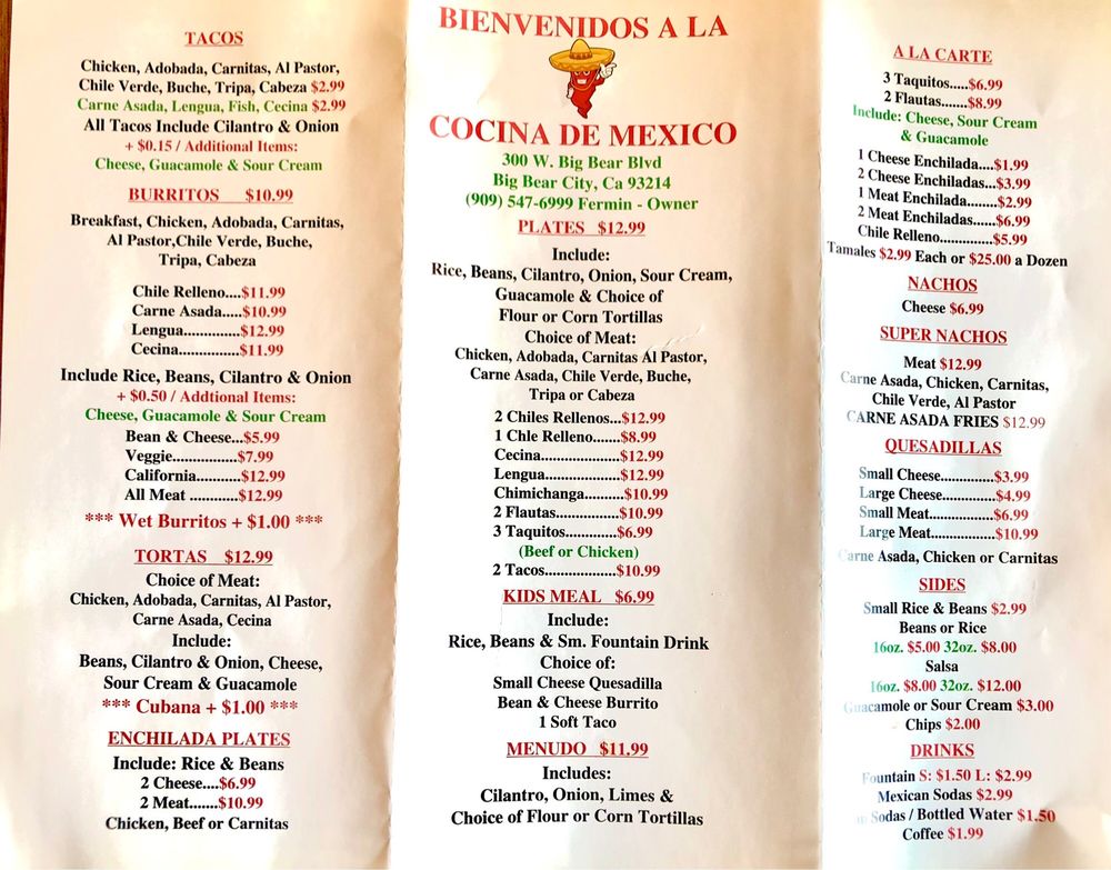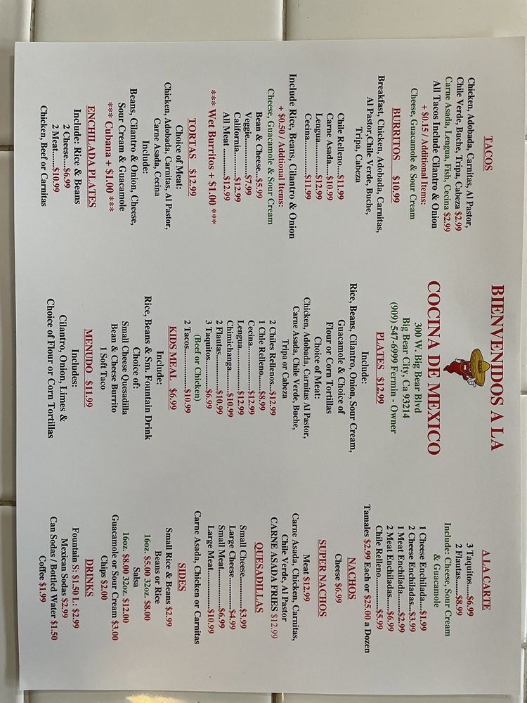 Welcome to Cocina De Mexico, a hidden gem in Big Bear City that captures the authentic flavors of Mexican cuisine. This cozy spot specializes in mouthwatering tacos, offering a delightful variety of meats including carne asada and carnitas, praised by locals and visitors alike.